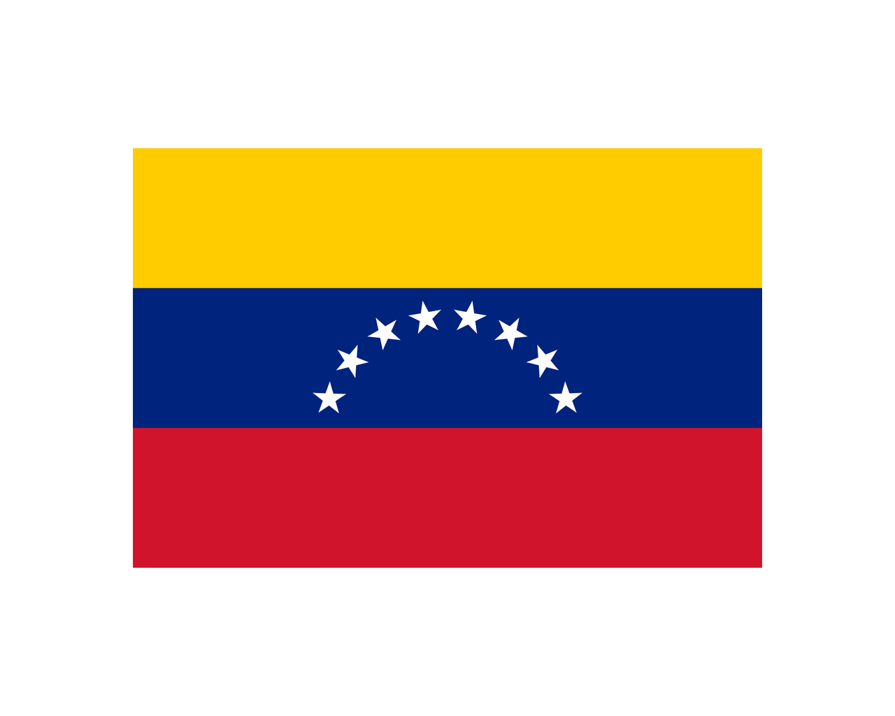 委內(nèi)瑞拉玻利瓦爾共和國(Bolivarian Republic of Venezuela),簡稱委內(nèi)瑞拉,是位于南美洲北部的國家,首都加拉加斯。委內(nèi)瑞拉國旗啟用于1811年,國旗呈長方形,長寬之比為3:2。旗面自上而下由黃、藍、紅三個平行相等的橫長方形相連而成。旗面中央有八顆白色五角星,呈弧形排列;左上角繪有國徽圖案。黃、藍、紅三色來自原大哥倫比亞共和國國旗顏色,黃色代表豐富的資源,藍色代表天空和大海,紅色代表獨立戰(zhàn)爭中犧牲的戰(zhàn)士的鮮血。七顆五角星代表1811年委內(nèi)瑞拉聯(lián)邦的七個省。政府機構(gòu)使用帶國徽的國旗,民間使用了不帶國徽的國旗。在時任總統(tǒng)查韋斯的推動下,2006年3月7日,委內(nèi)瑞拉國民議會通過了對國旗和國徽的修改意見,決定把國旗上7顆星增加為8顆。新增加的一顆星代表1817年擺脫西班牙統(tǒng)治、并入委內(nèi)瑞拉的圭亞那省。