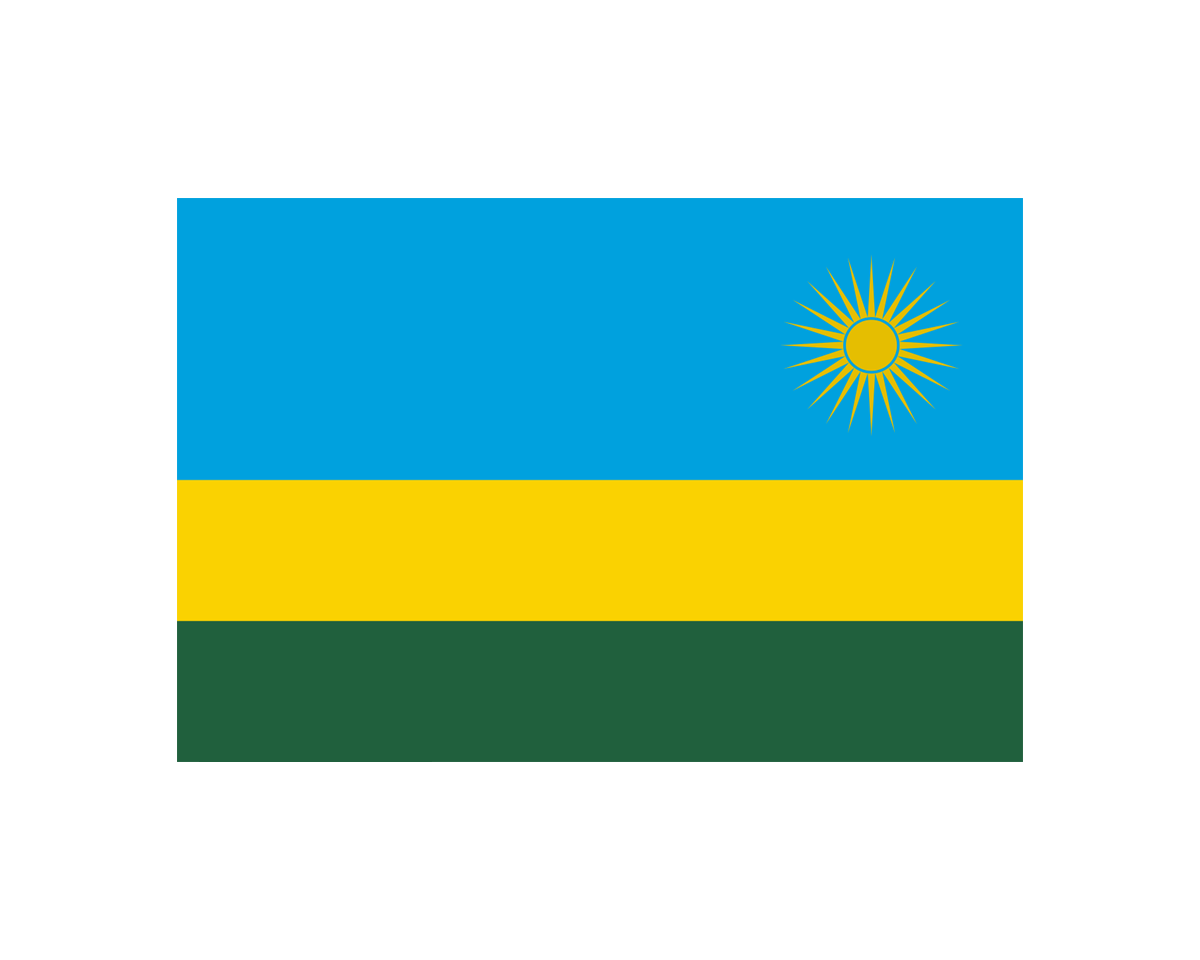 盧旺達(dá)共和國(guó)(Republic of Rwanda),是非洲中東部的一個(gè)主權(quán)國(guó)家。西面與剛果民主共和國(guó)(DRC)交界,東鄰坦桑尼亞,北與烏干達(dá)接壤,南連布隆迪,首都基加利。盧旺達(dá)國(guó)旗啟用于2001年10月25日,由一位工程師也是藝術(shù)家設(shè)計(jì)。國(guó)旗長(zhǎng)寬比例為3:2。國(guó)旗為藍(lán)黃綠三色旗。藍(lán)色代表人民必須為和平而戰(zhàn)方能使經(jīng)濟(jì)持續(xù)成長(zhǎng)并帶來(lái)快樂(lè)生活;黃色代表人民必須安居樂(lè)業(yè)以促進(jìn)永久的經(jīng)濟(jì)發(fā)展;綠色象征藉由人民合理的開(kāi)發(fā)達(dá)到繁榮的希望,也象征國(guó)家的資源。右上方有一二十四道光芒的太陽(yáng)標(biāo)志,二十四道光芒指引著全國(guó)人民,表示團(tuán)結(jié)一致、純真透明,與對(duì)抗無(wú)知的奮斗。