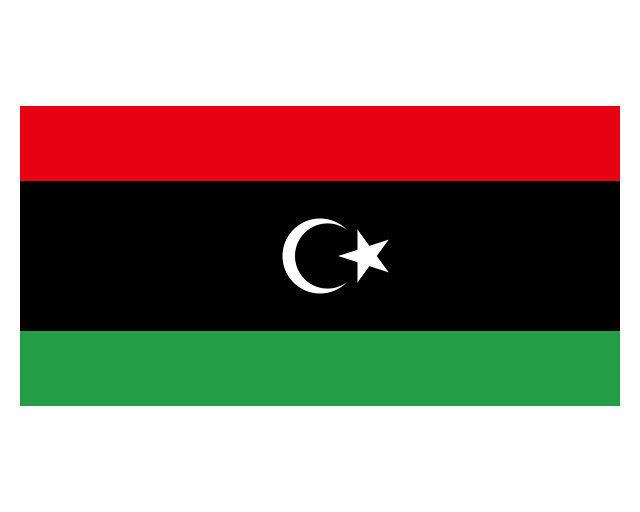 利比亞國(State of Libya),簡稱“利比亞”,是北非的一個國家,位于地中海南岸,首都的黎波里。利比亞國旗為紅、黑、綠三色橫旗。中間黑色帶子代表昔蘭尼加地區,闊度是紅色和綠色帶子的兩倍。黑色帶子中央的新月和五芒星是多數阿拉伯穆斯林國家的傳統標志,這個設計來源自塞努西穆斯林教派黑底新月五芒星旗。紅色帶子代表費贊地區,亦象征人民的鮮血;而綠色帶子代表的黎波里塔尼亞地區和伊斯蘭教,亦是繁榮的象征。