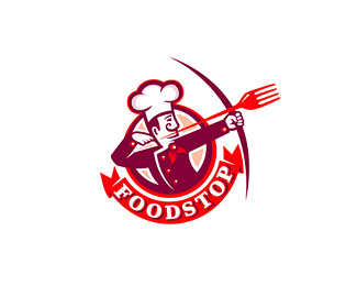 Foodstop餐飲店標志設計,融入廚師、刀叉元素,整體動作呈射箭形狀,紅色是主色調。