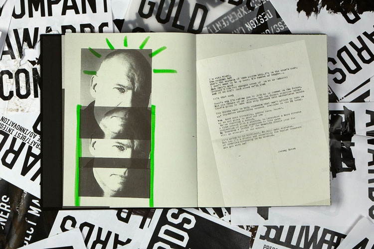 這個身份被設(shè)計成“無政府主義”“憤怒”,格雷·倫敦說,這本書的新年度封面是預(yù)先撕毀和弄亂的頁面,污損了創(chuàng)意圈主席和陪審員的照片,墨水故意濺到書頁上。